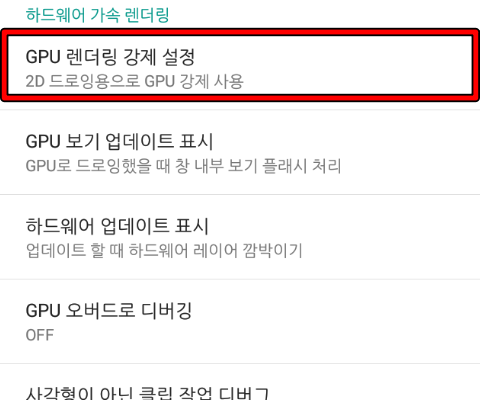 ▲ 하드웨어 가속 렌더링 부분에서 GPU 렌더링 강제 설정을 클릭합니다.