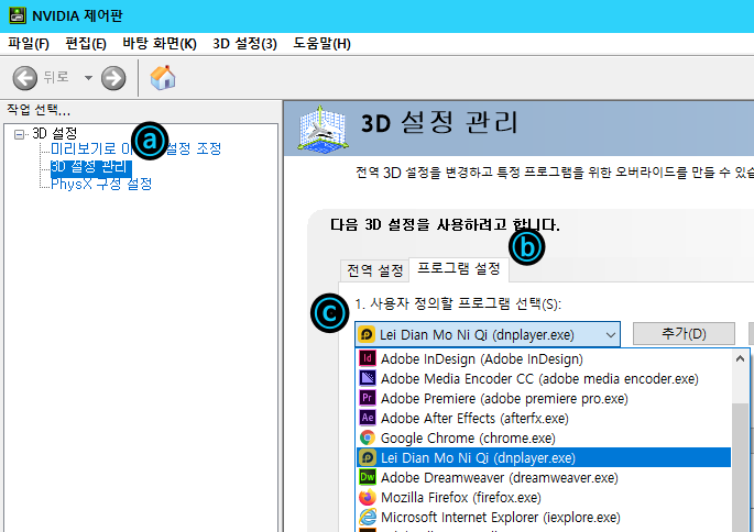▲ 제어판에서 위와 같은 순서로 LD플레이어 그래픽 카드 사용 설정을 진행해주시면 됩니다.