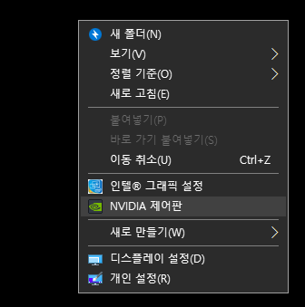 먼저 PC에 그래픽 카드가 설치되어 있는 경우 바탕화면 오른쪽 클릭을 하면 'NVIDIA 제어판'을 확인할 수 있습니다.