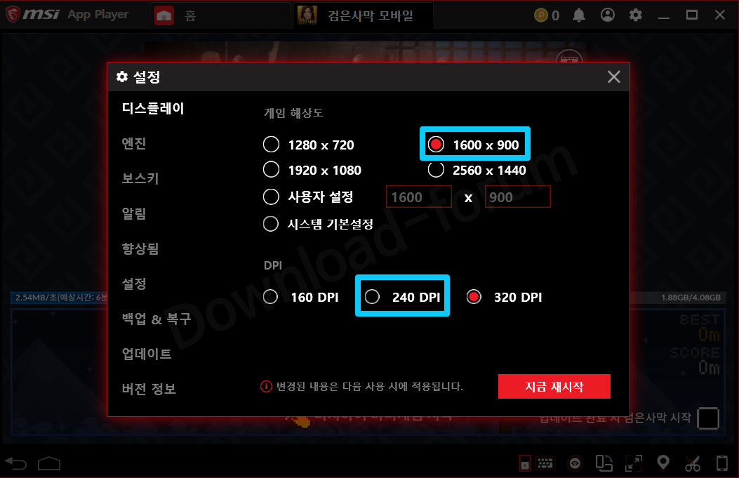 MSI앱플레이어 디스플레이 최적화