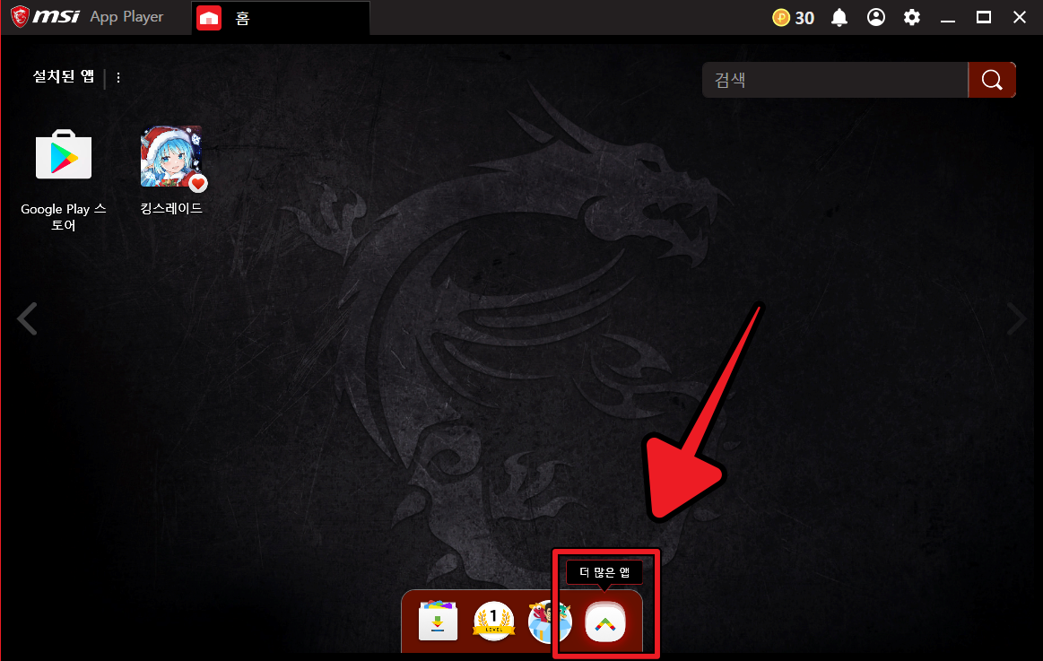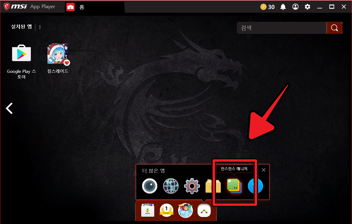 ▲ MSI 앱플레이어 최신 버전 다운로드 인스톨 후 실행하면 앱플레이어 하단 메뉴에 [더 많은 앱] 메뉴가 있습니다. 이것을 클릭하여 멀티 생성을 위한 인스턴스 매니저를 찾습니다.