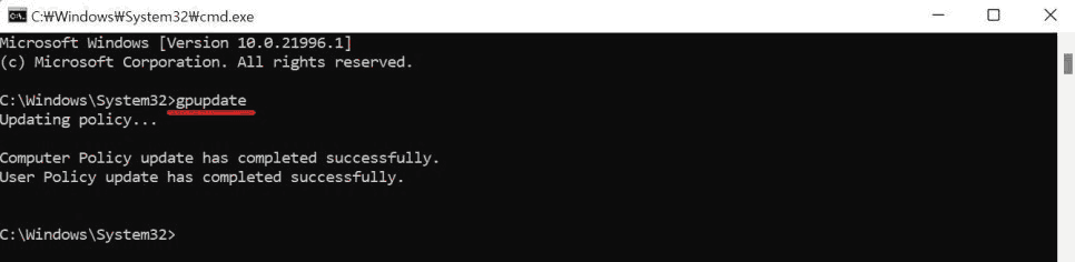 gpupdate 명령을 실행하고 잠시 기다립니다. User Policy update has completed successfully 메시지가 표시되면 cmd 창을 닫습니다.