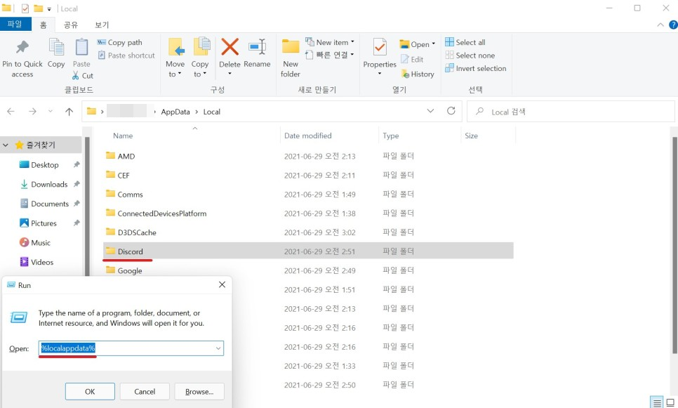 3. %localappdata% 폴더에서 Discord 관련 폴더 삭제