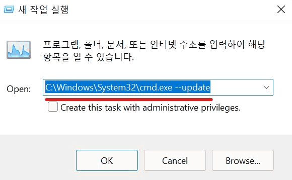작업 관리자에서 파일/새 작업 실행 메뉴를 클릭한 다음 C:\Windows\System32\cmd.exe --update를 입력하고 Enter 키를 누릅니다.