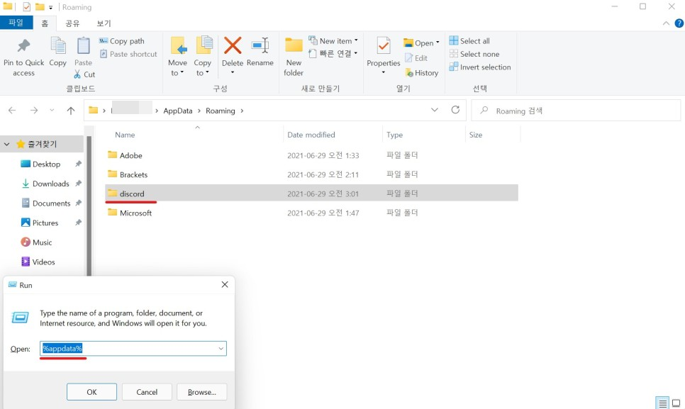 2. %appdata% 폴더에서 Discord 관련 폴더 삭제