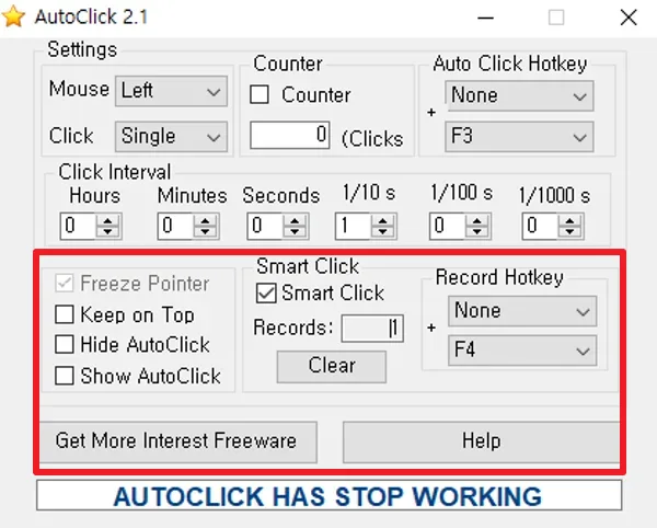 1에서 3까지 설정하여 자동 클릭을 수행하는 키를 설정합니다. 기본값은 F3 버튼이지만 이 두 키의 조합을 사용하여 변경할 수 있습니다. - Click Interval - Hours / Minutes / Seconds / 1/10s / 1/100s / 1/1000