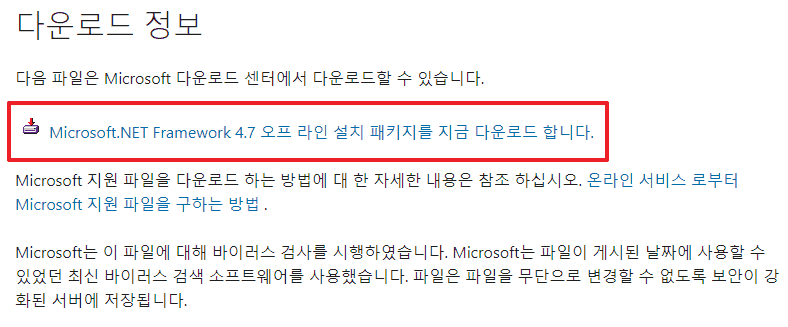 위 링크를 클릭하여 Windows .NET Framework 4.7 오프라인 설치 페이지로 이동할 수 있습니다.