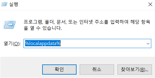 [윈도우 키] + [R]을 입력하여 실행창을 열어 %localappdata%를 입력하여 Local 폴더로 접근합니다.
