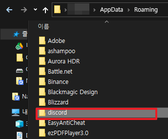 폴더 내부에 설치되어 있는 [discord] 폴더를 삭제합니다.