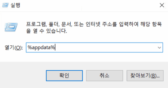 [윈도우 키] + [R]을 입력하여 실행창을 열어 %appdata%를 입력하여 AppData 폴더로 접근합니다.