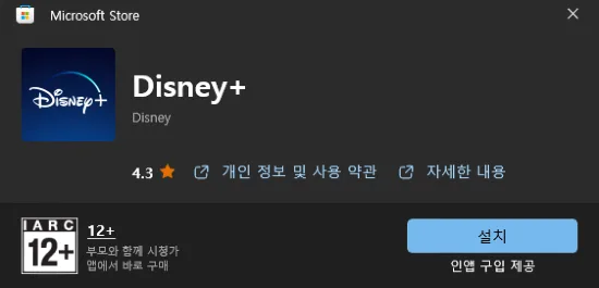 우측 아래 [설치] 버튼을 클릭하여 디즈니 플러스 PC 앱 설치를 진행합니다.