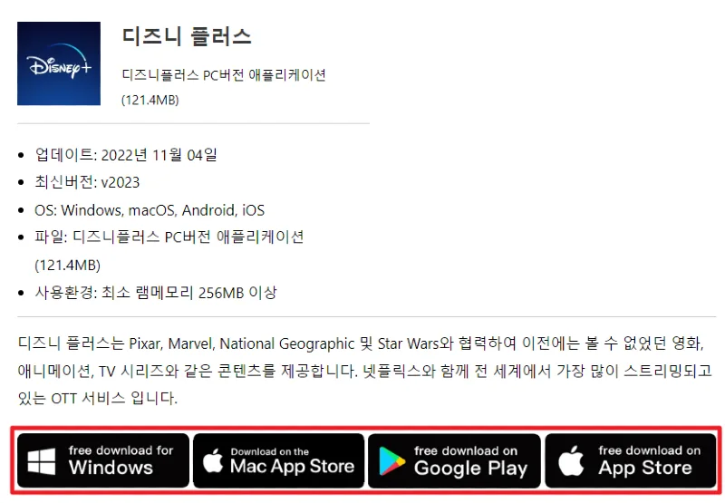 | 다운로드 파일 | 디즈니플러스 PC 앱(121.4MB) |