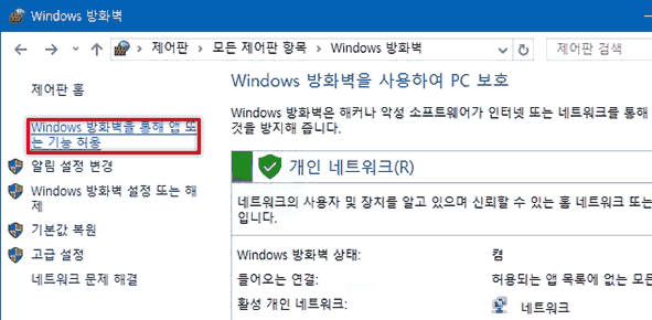2. Windows 방화벽 좌측 메뉴에 있는 [Windows 방화벽을 통해 앱 또는 기능 허용]을 클릭합니다.