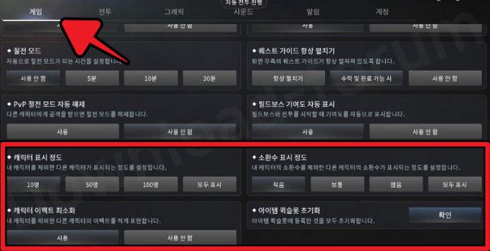 캐릭터 표시 정도 및 소환수 표시 정도를 가장 최솟값으로 설정합니다. 이렇게 설정한 이유는 V4 인터서버 레이드 콘텐츠를 기준으로 맞춘 설정입니다.