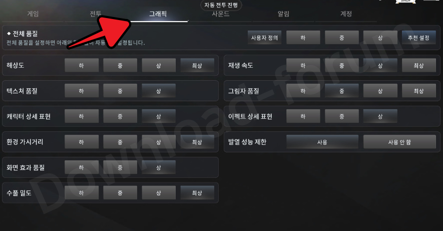 여기서 저는 크게 건드리지 않았습니다. 다만 LD플레이어에서 렉이 발생하거나 버벅거리면 그래픽 설정을 조금 낮추어야 합니다. 그런데 게임의 그래픽 품질에 크게 영향을 미치지 않는 항목들의 설정을 낮춰주는 것이 이득이겠죠?