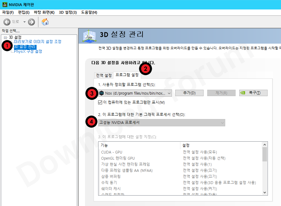 ▲ NVIDIA 제어판에서 아래와 같이 설정하면 LD플레이어로 최신 모바일 게임을 실행시 그래픽 카드를 실행하여 CPU의 부담을 줄여줍니다.