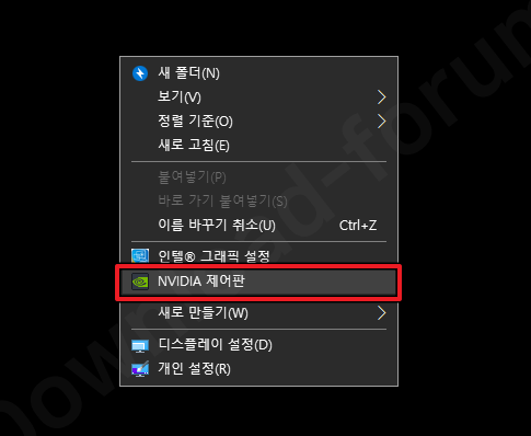 LD플레이어를 사용 시 그래픽카드를 가동하여 V4를 더욱 원활히 시키기 위한 그래픽 최적화 작업을 진행하기 위해 바탕화면에서 마우스 오른쪽 버튼을 클릭하여. NVIDIA 제어판으로 이동합니다.