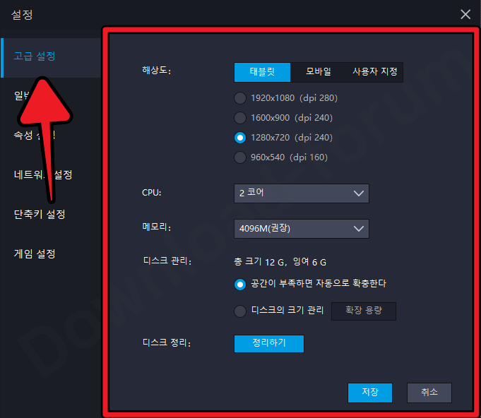 - 디스크 관리 : V4 다운로드 중 혹은 LD플레이어 사용 중 저장공간 관련 오류 발생 시 해당 설정으로 저장공간을 자동으로 확충할 수 있습니다.