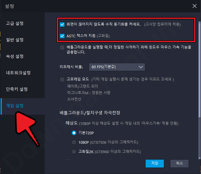 다음으로 게임 설정으로 이동하여 '화면이 끊어지지 않도록 수직 동기화를 켜세요.' 및 'ASTC 텍스처 지원' 설정에 체크를 합니다. 프레임의 경우 V4 게임 내에서 최적화 설정을 진행할 것입니다.