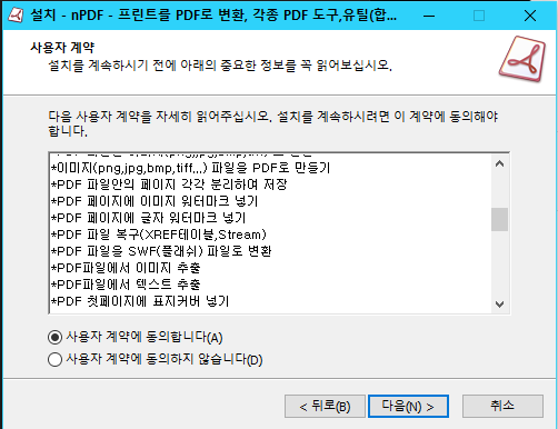 ▲ 무료로 사용할 수 있는 프리웨어로 사용자 계약 등에 동의 후 [다음] 버튼을 클릭하여 nPDF 설치를 진행합니다.