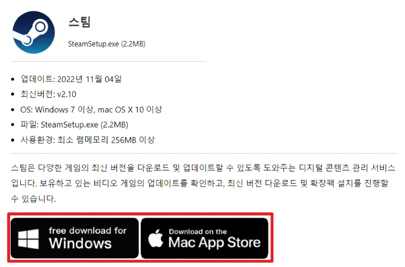 | 다운로드 파일 | SteamSetup.exe (2.2MB) |