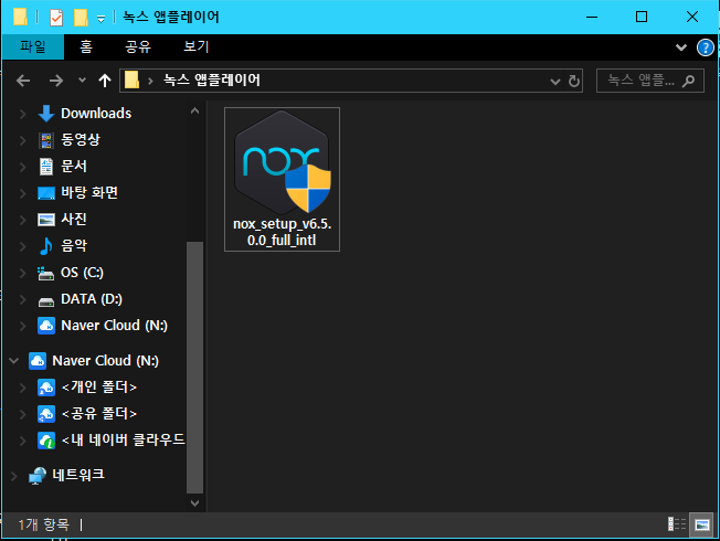 공유 중인 다운로드 버튼을 클릭하여 녹스 앱플레이어 설치 파일을 다운로드하면, 위와 같이 녹스 설치 파일이 다운됩니다. 이 파일을 사용하여 설치를 진행하시면 됩니다.