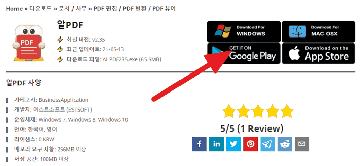공유드린 링크를 통해 이스트소프트 알툴즈 알PDF 다운로드 페이지들어갑니다. 사용중인 PC의 운영체제에 알맞는 버전의 설치 파일을 다운로드하신 후 설치하시면 됩니다.