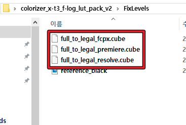 배포되는 LUT 파일에 따라 다르지만, 위와 같이 프리미어 프로 LUT / 파이널 컷 LUT / 다빈치 리졸브 LUT 파일을 따로 공유하는 경우가 있습니다.