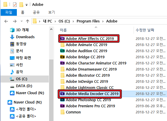 미디어 인코더와 애프터 이펙트 설치 폴더도 프리미어 프로 설치 폴더와 같은 경로에 있습니다.