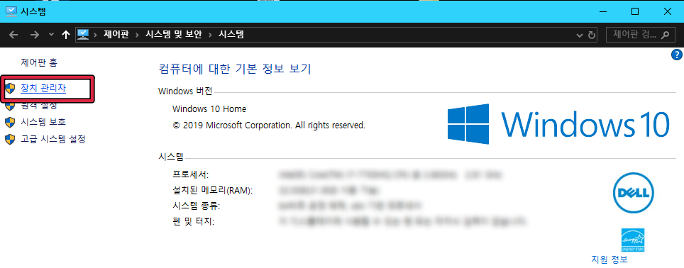 ▲ 위와 같은 화면에서 좌측 메뉴 중 [장치 관리자] 메뉴로 이동합니다.