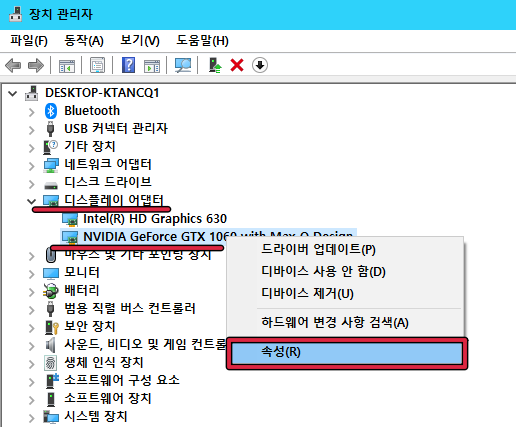 ▲ 장치 관리자에서 [디스플레이 어댑터]에 포함되어 있는 엔비디아 그래픽카드를 우측 클릭하여 [드라이버 업데이트]를 바로 진행하거나 [속성]을 확인합니다.