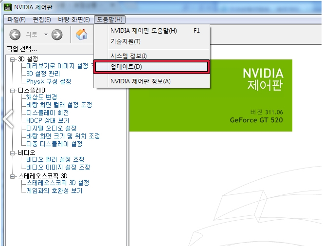 ▲ NVIDIA 제어판에서 상단 메뉴 중 [도움말] 메뉴에 포함되어 있는 [업데이트] 항목을 클릭합니다.