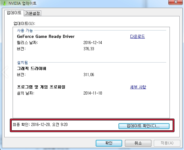 ▲ NVIDIA 제어판의 업데이트 기능에서 현재 설치된 엔비디아 그래픽 카드 드라이버의 버전과 [업데이트 확인]을 클릭하여 최신 버전의 그래픽 카드 드라이버를 탐색할 수 있습니다.