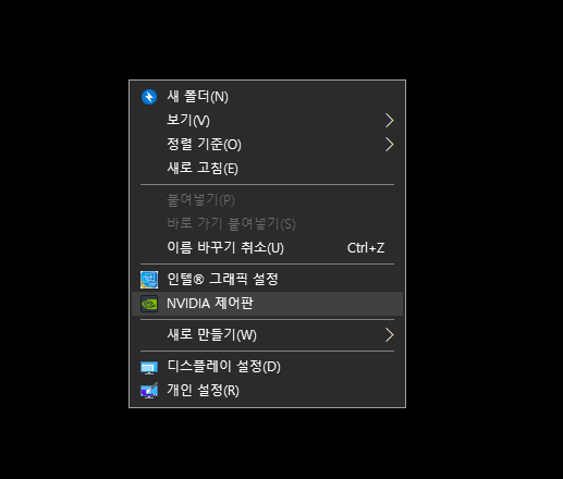 ▲ 윈도우의 바탕화면에서 빈 공간에 우측 클릭하여 [NVIDIA] 제어판에 접근할 수 있습니다.
