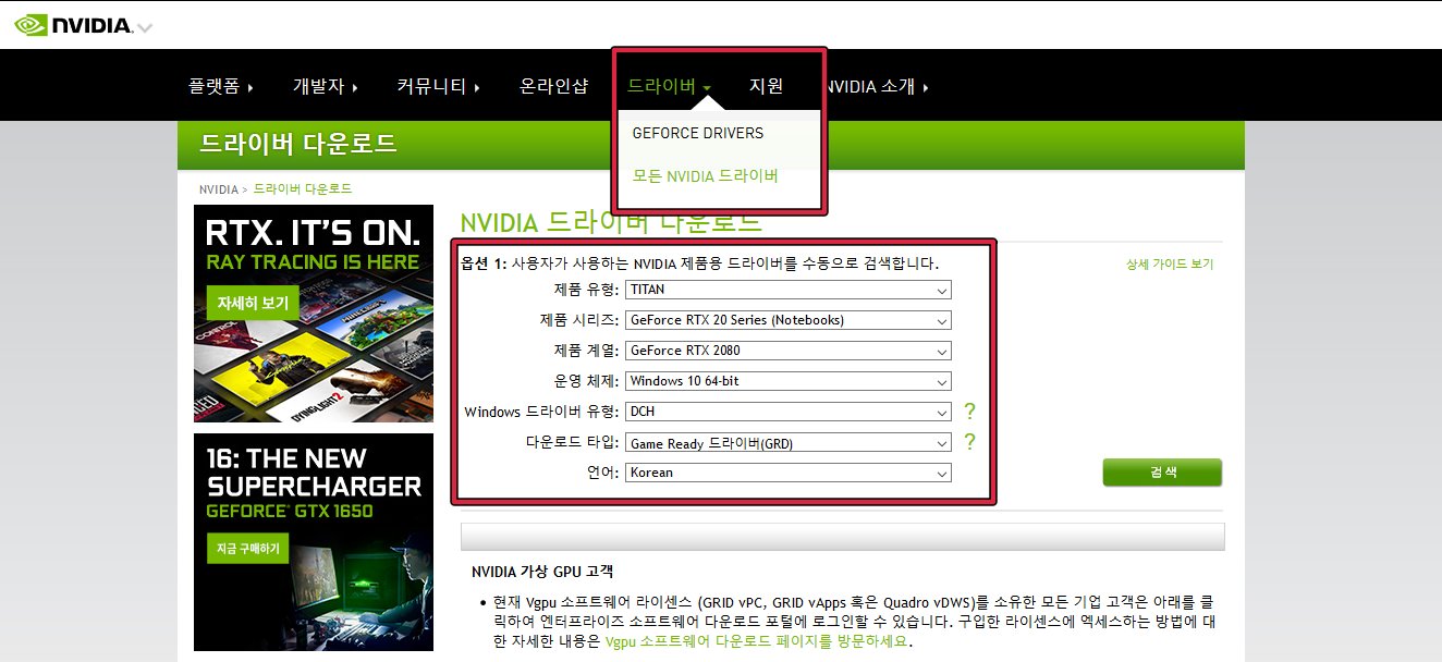 Nvidia 제어판에서 그래픽카드 드라이버 다운로드